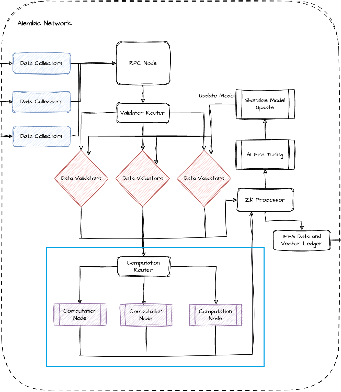 在所示的网络中（见图1），计算节点以蓝色矩形突出显示。这些节点接收来自验证节点的验证数据集，并将其转换为向量格式，以便进行训练。