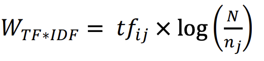 其中，tf\_ij、N 和 n\_j 分别表示推文 𝑖 中术语 𝑗 的原始词频、数据集中推文的总数以及术语 𝑗 出现的推文数量。