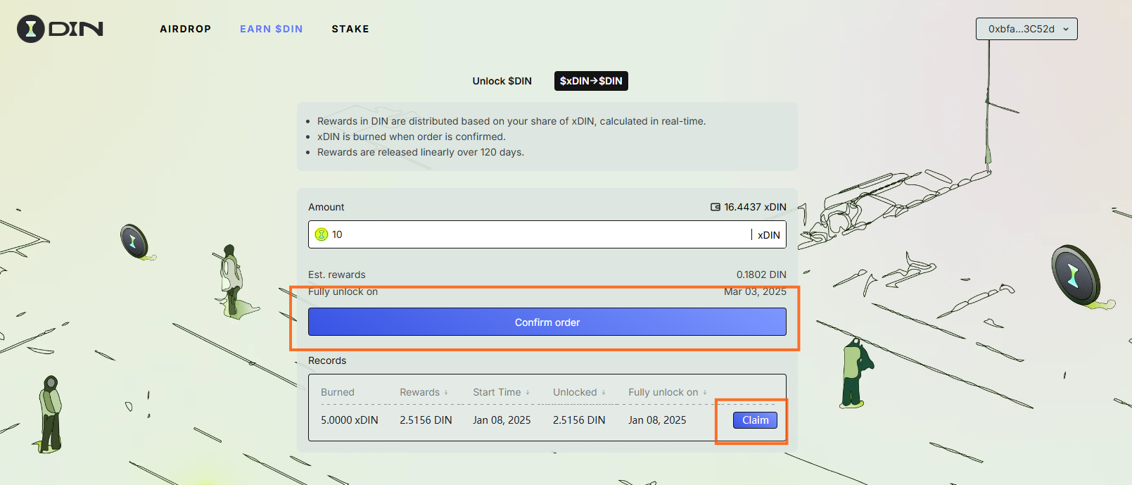 Raise an Unlock Request by clicking the 'Unlock' button. Users can claim $DIN gradually based on an unlocking schedule: