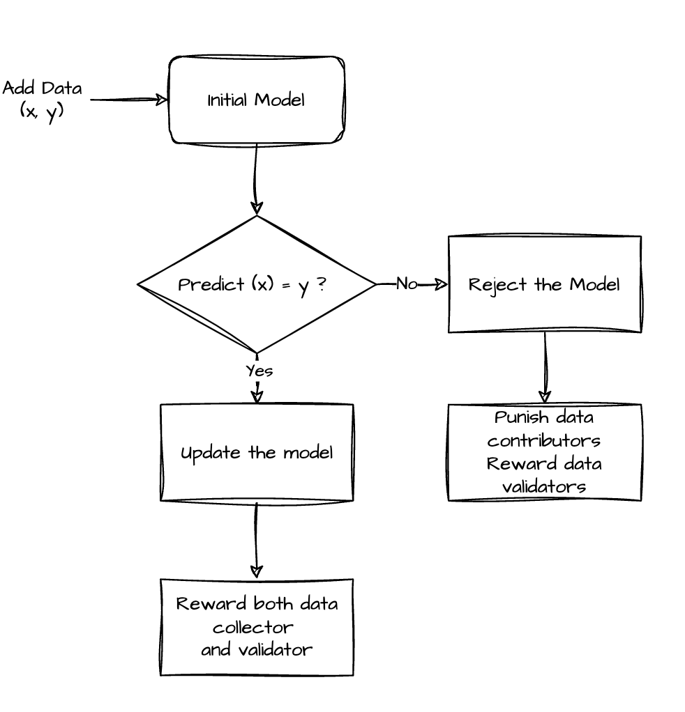 * **보증금 요구**: 모든 데이터 제출에 대해 보증금이 요구되며, 이 보증금은 데이터 **x**와 관련된 레이블 **y**를 포함합니다. 이는 데이터와 메타데이터가 블록체인에 안전하게 기록되도록 보장하며, 데이터 기여에 대한 책임감과 품질을 촉진하는 환경을 만듭니다.